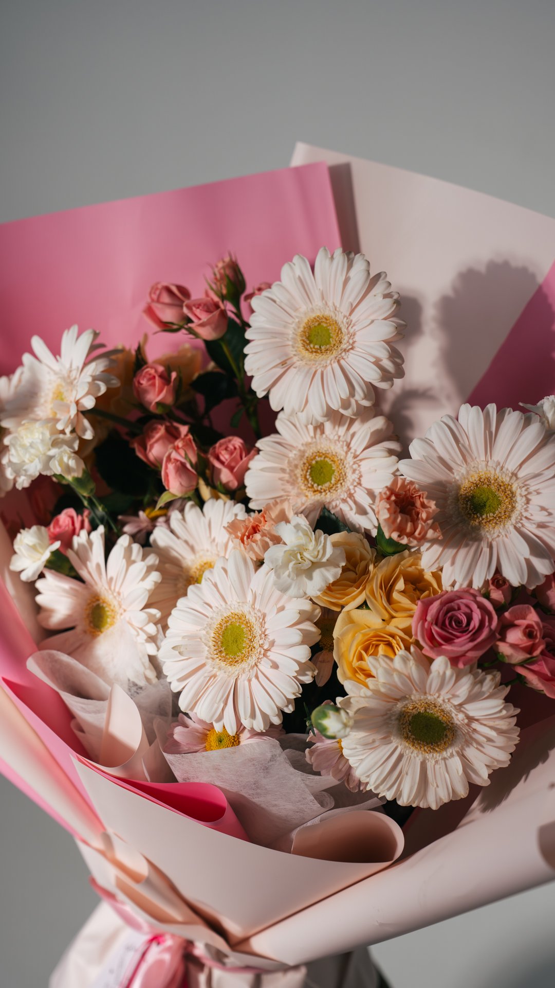 Ramo con 10 gerberas, 8 margaritas y 6 mini rosas.